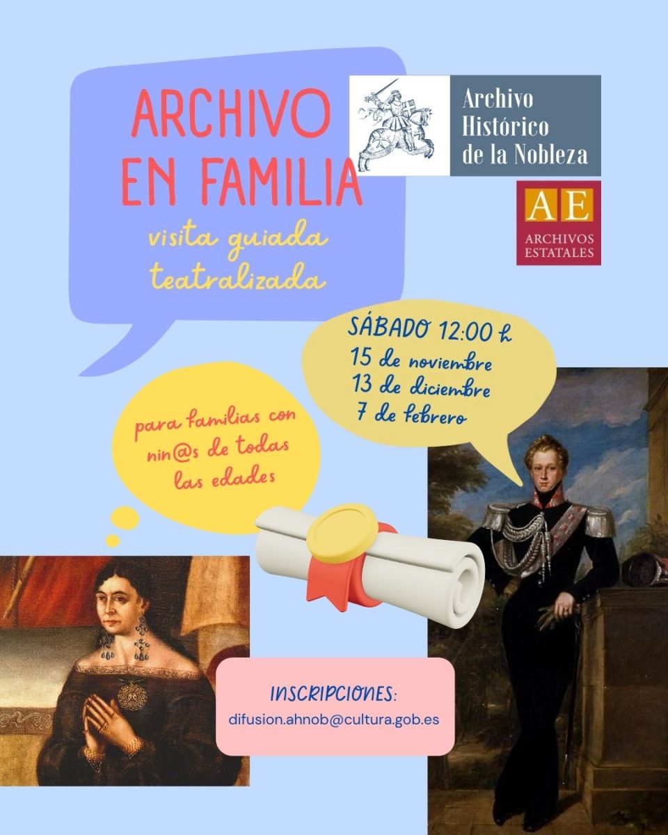 Archivo en Familia tendrá lugar los próximos sábados 15 de noviembre, 13 de diciembre y 7 de febrero a las 12:00 h. Es una actividad gratuita en la que pueden participar todas las familias que lo deseen. Es necesario inscribirse previamente enviando un correo electrónico a difusion.ahnob@cultura.gob.es