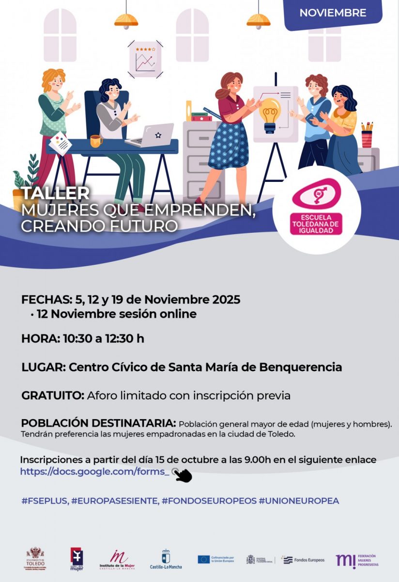 Inscripciones a partir del 15 de octubre de 2025, a las 9.00h en el siguiente enlace: Preinscripción Taller emprendimiento. Escuela Toledana de Igualdad. Ayuntamiento de Toledo.