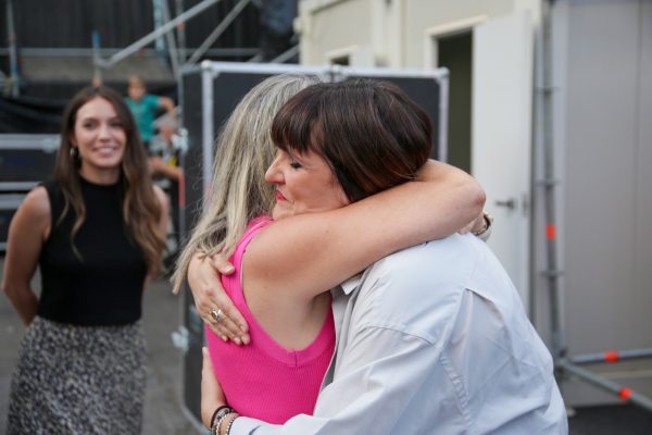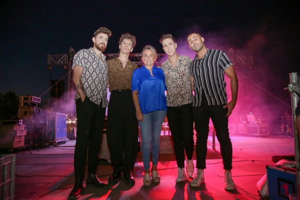 La alcaldesa comparte los minutos previos al concierto en La Peraleda con los componentes del grupo toledano ‘Veintiuno’
