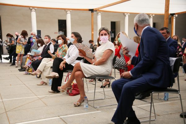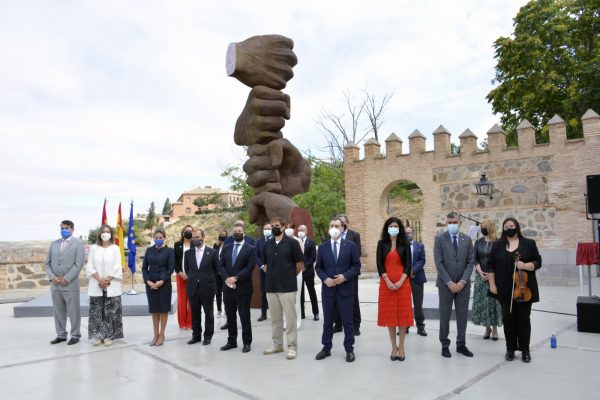 La alcaldesa, en el homenaje de las Cortes a las víctimas del COVID-19, simbolizado en una escultura del toledano Tortajada