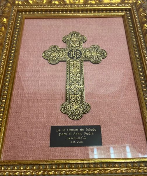 Una cruz damasquinada, obra del maestro Mariano San Félix, obsequio de la ciudad de Toledo al Papa Francisco