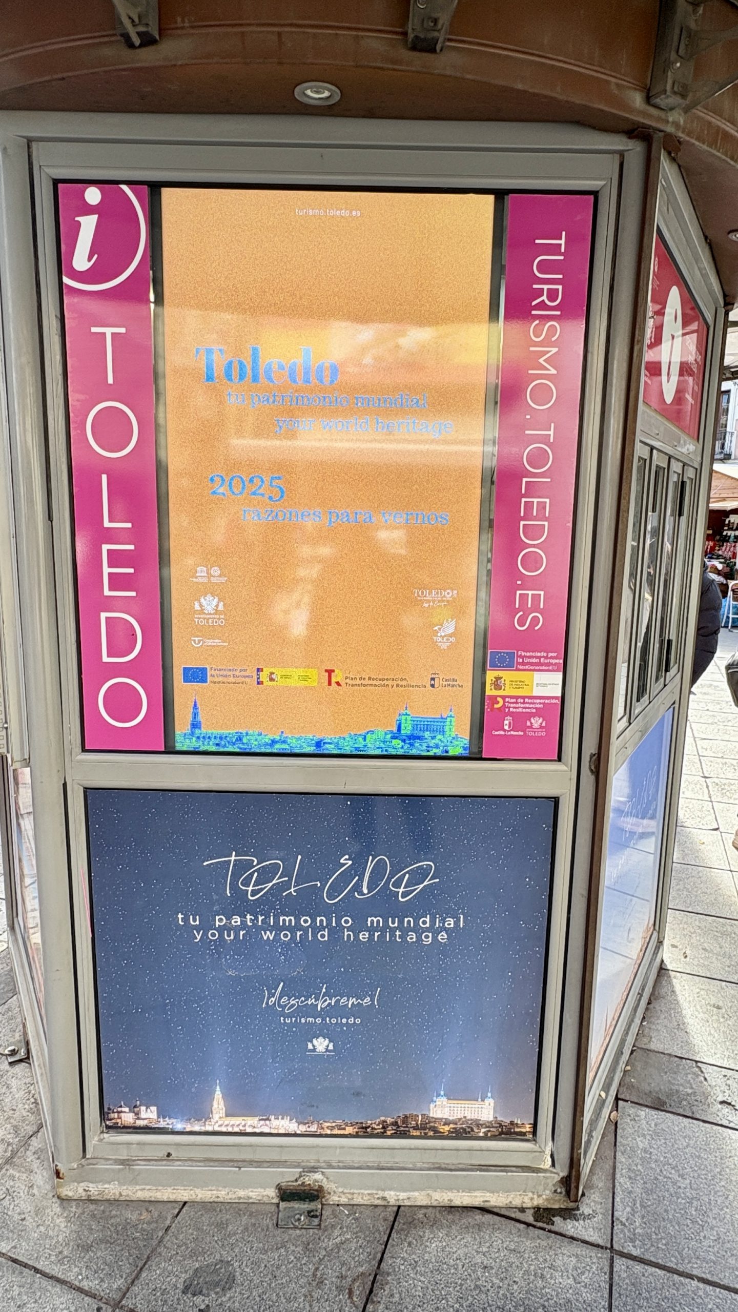 Con contenidos informativos actualizados y comunicación institucional de apoyo a la atención presencial. - Un tótem de información y cartelería en el kiosko de turismo de la Plaza de Zocodover
