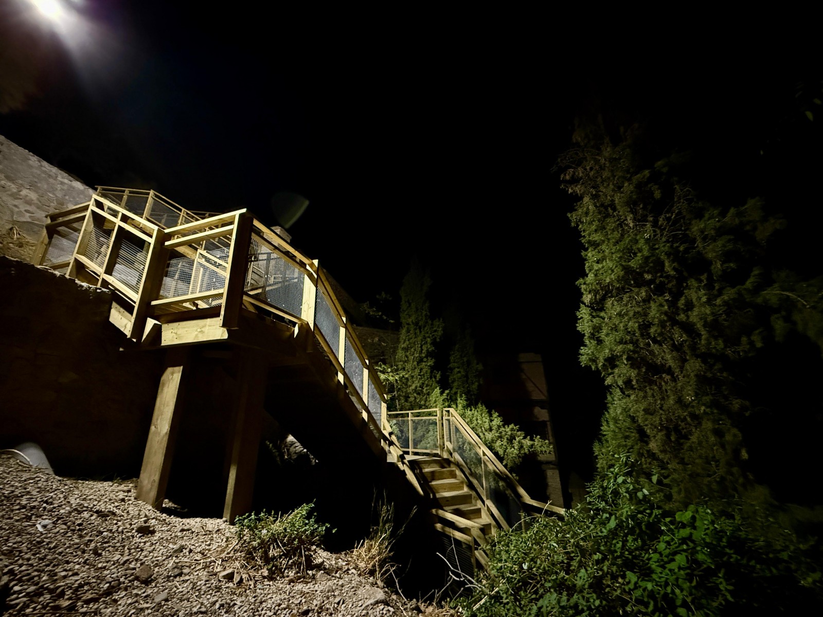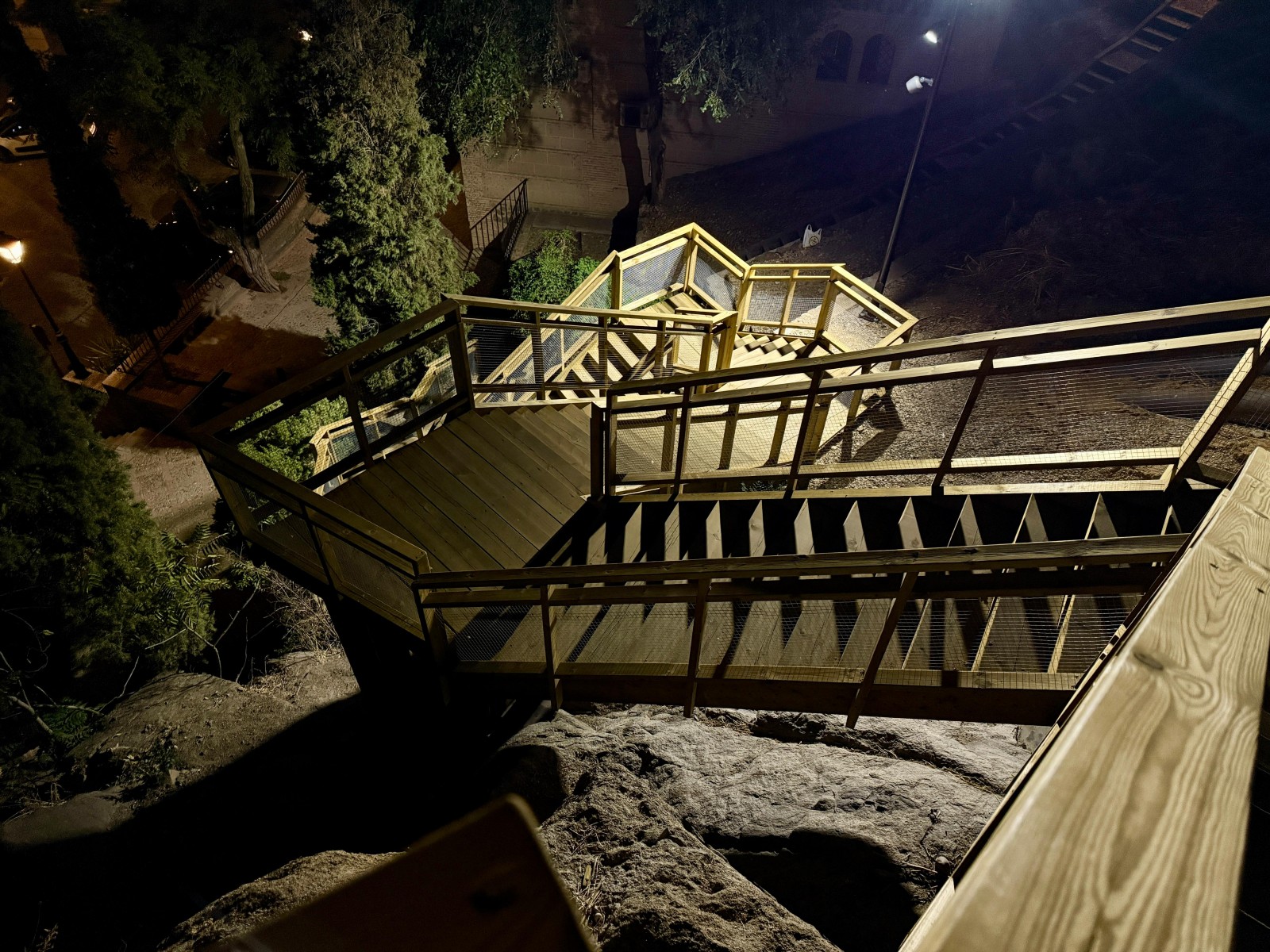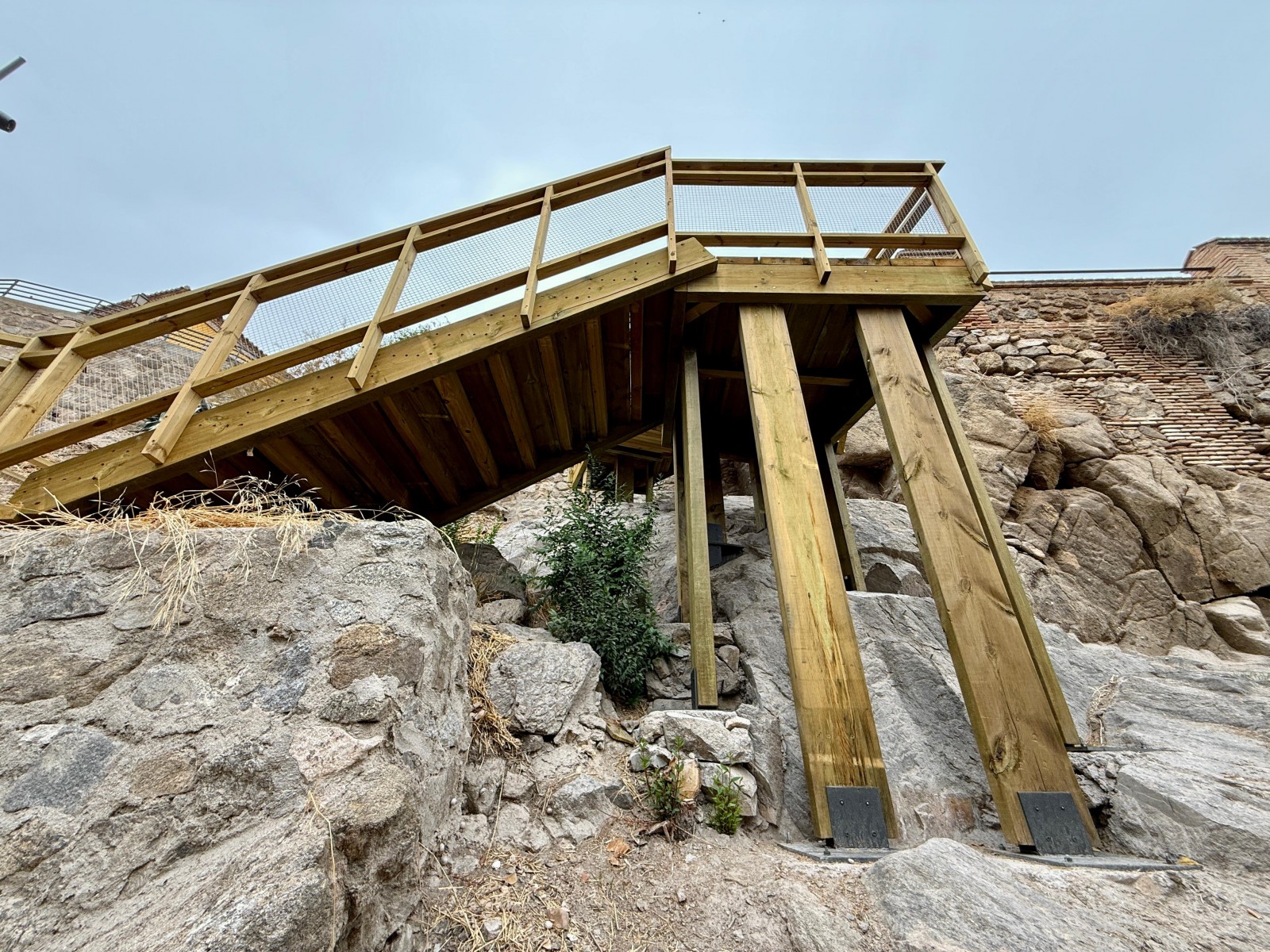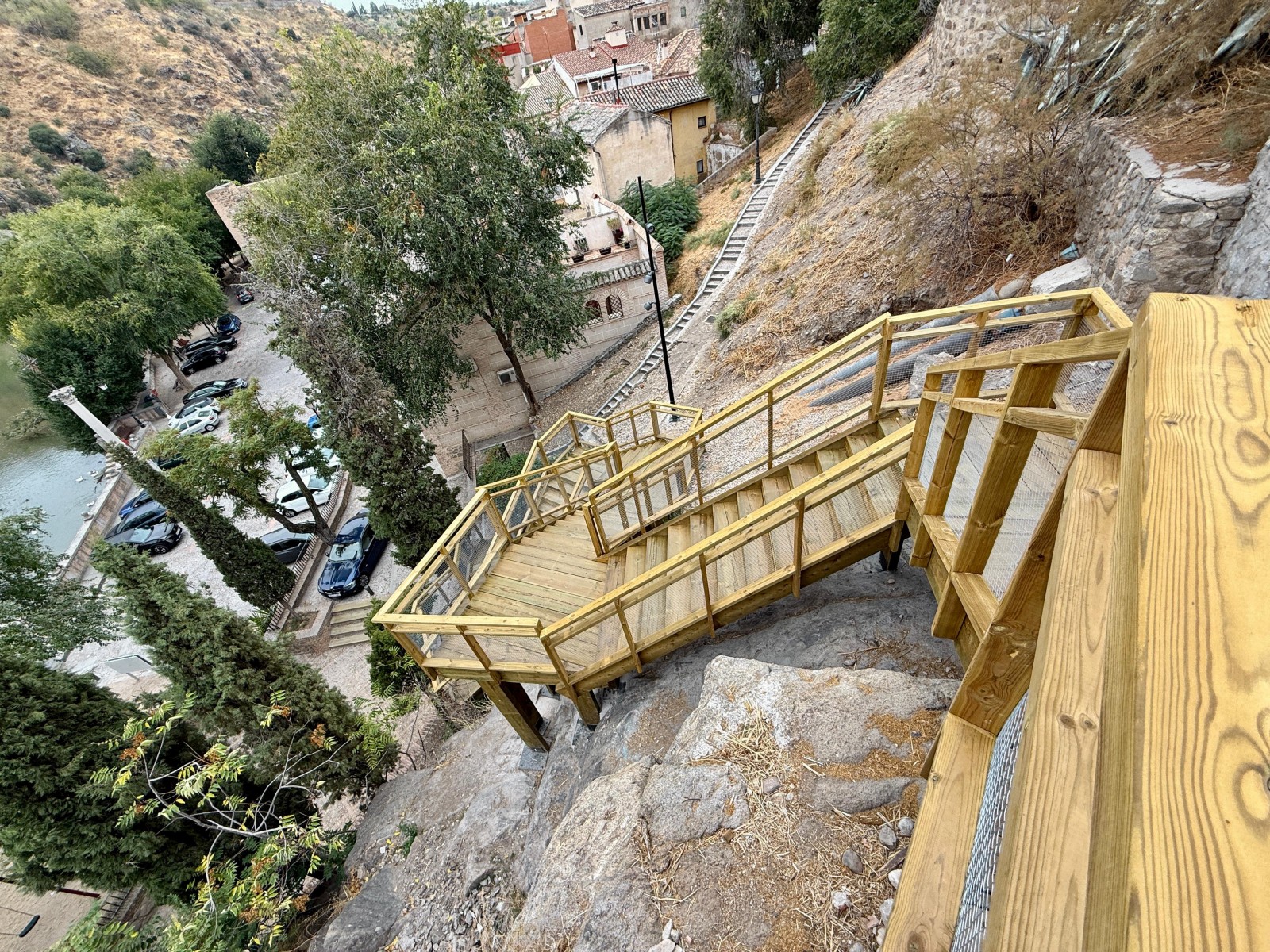 Las obras han sido realizadas por la empresa Trento Arquietectura S.L. y han consistido en la instalación de una escalera de madera que salva un desnivel de 15 metros, una infraestructura que se integra con el entorno y que permite dar fluidez al itinerario peatonal.
