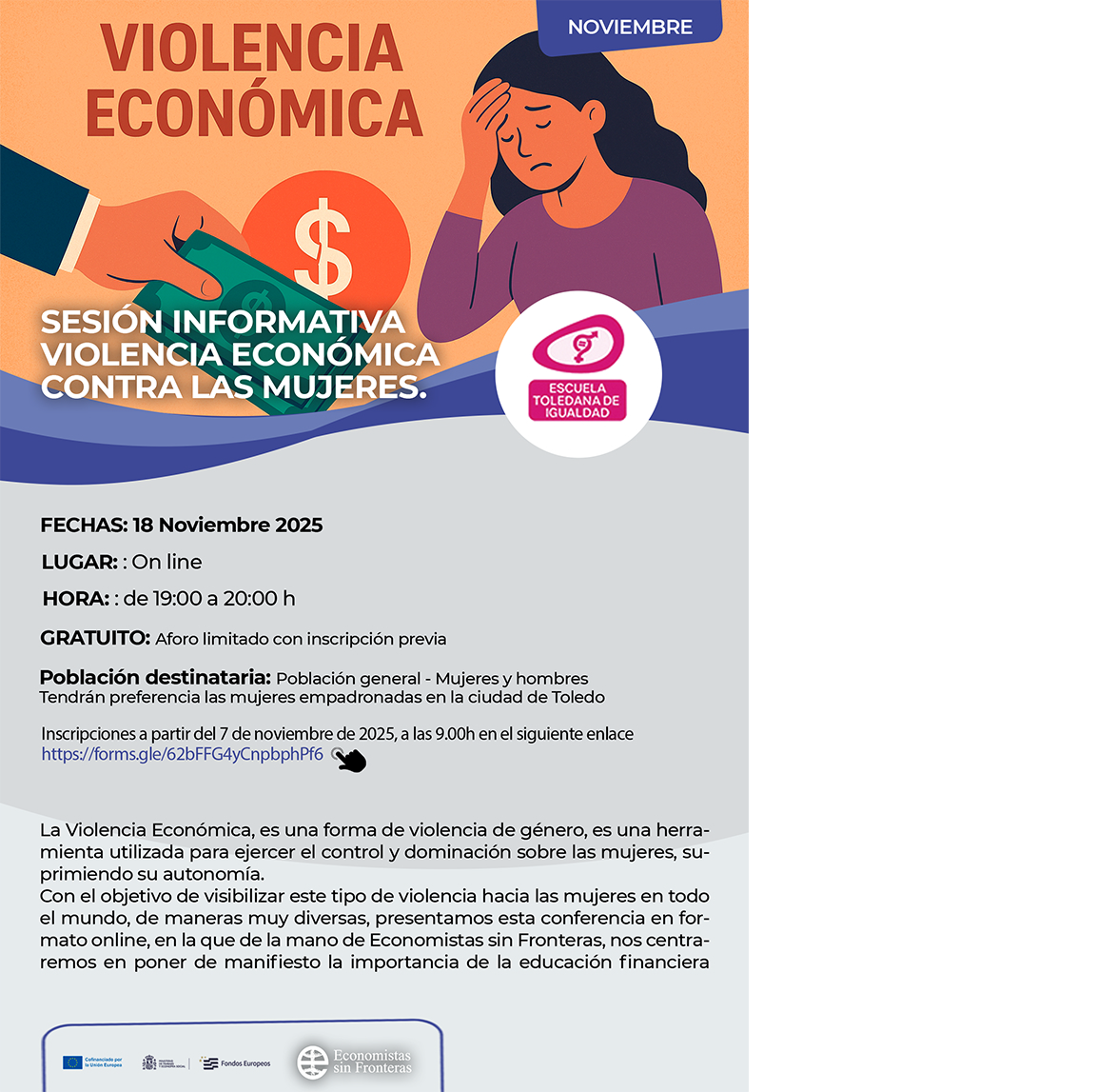 Por cuestiones ajenas a la organización, la actividad “Sesión informativa violencia económica contra las mujeres” de la Escuela Toledana de Igualdad que iba a tener lugar el martes 18 de noviembre SE POSTPONE a la espera de nueva fecha, la cual se comunicará.