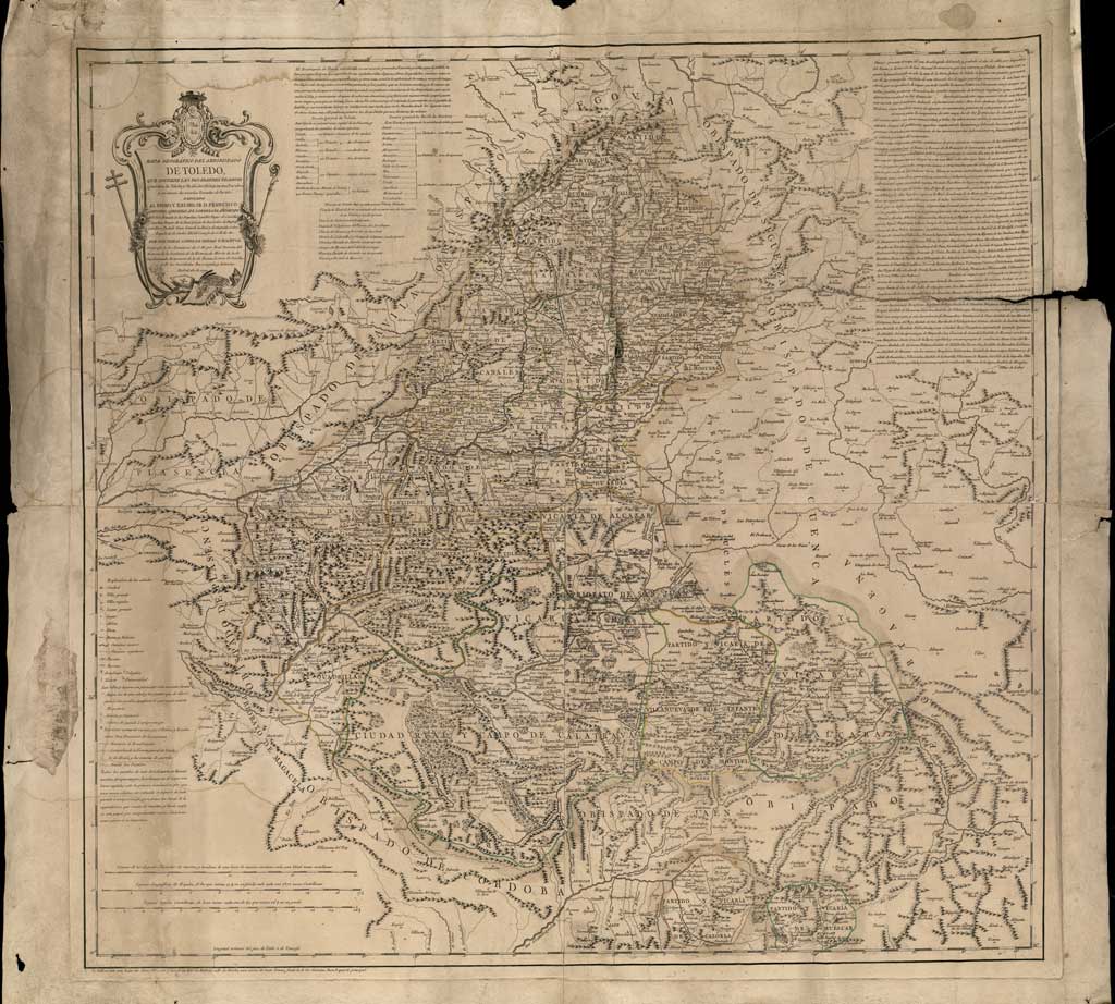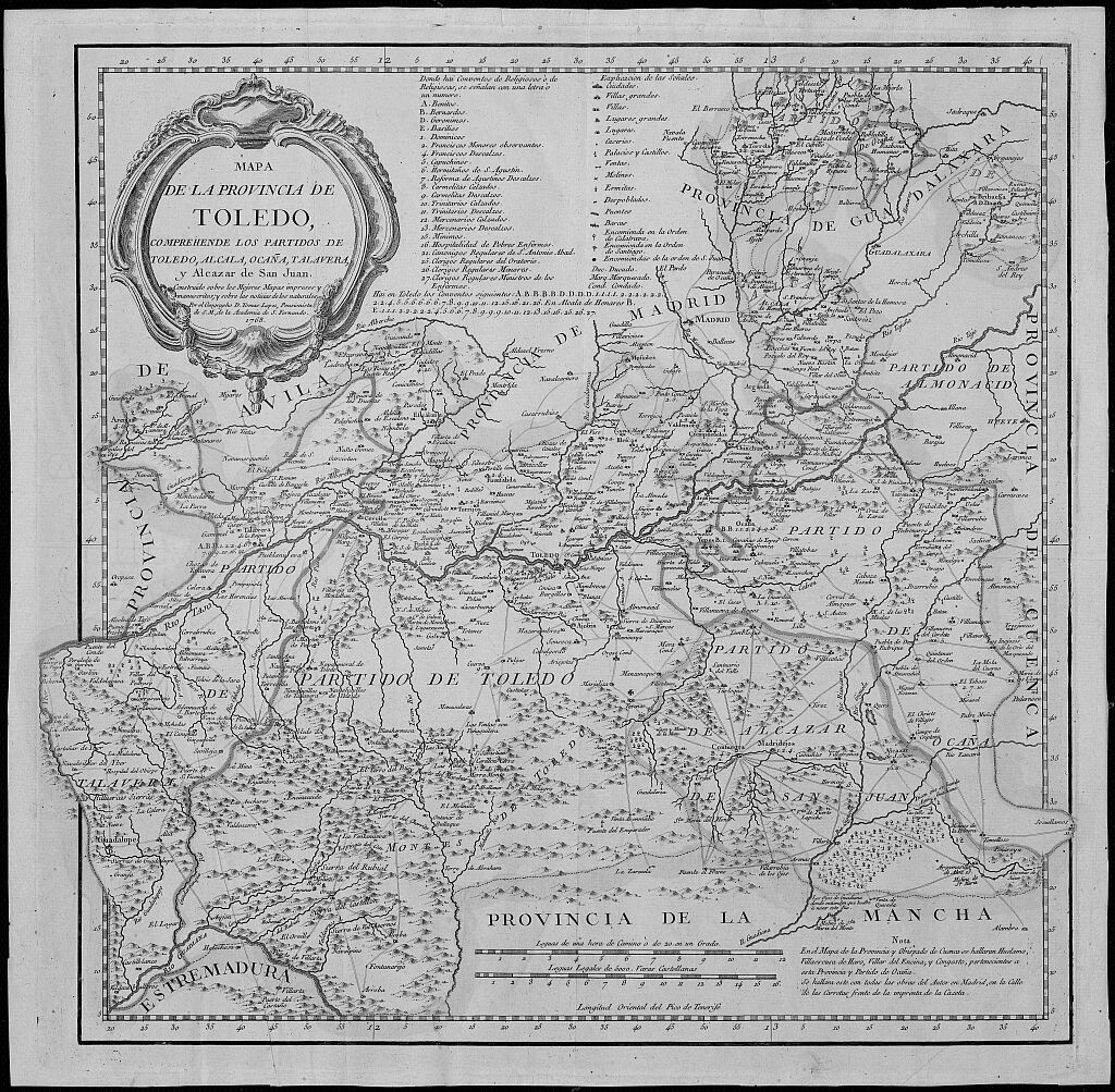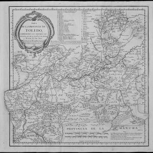 Mapa de la provincia de Toledo que comprende los partidos de Toledo, Alcalá, Ocaña, Talavera y Alcázar de San Juan realizado por el geógrafo Tomás López en 1768.
