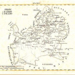 Mapa de las provincias de Toledo y Madrid realizado por el cartógrafo alemán August von Schlieben recogiendo los límites provinciales, los cursos de los ríos y las principales poblaciones.