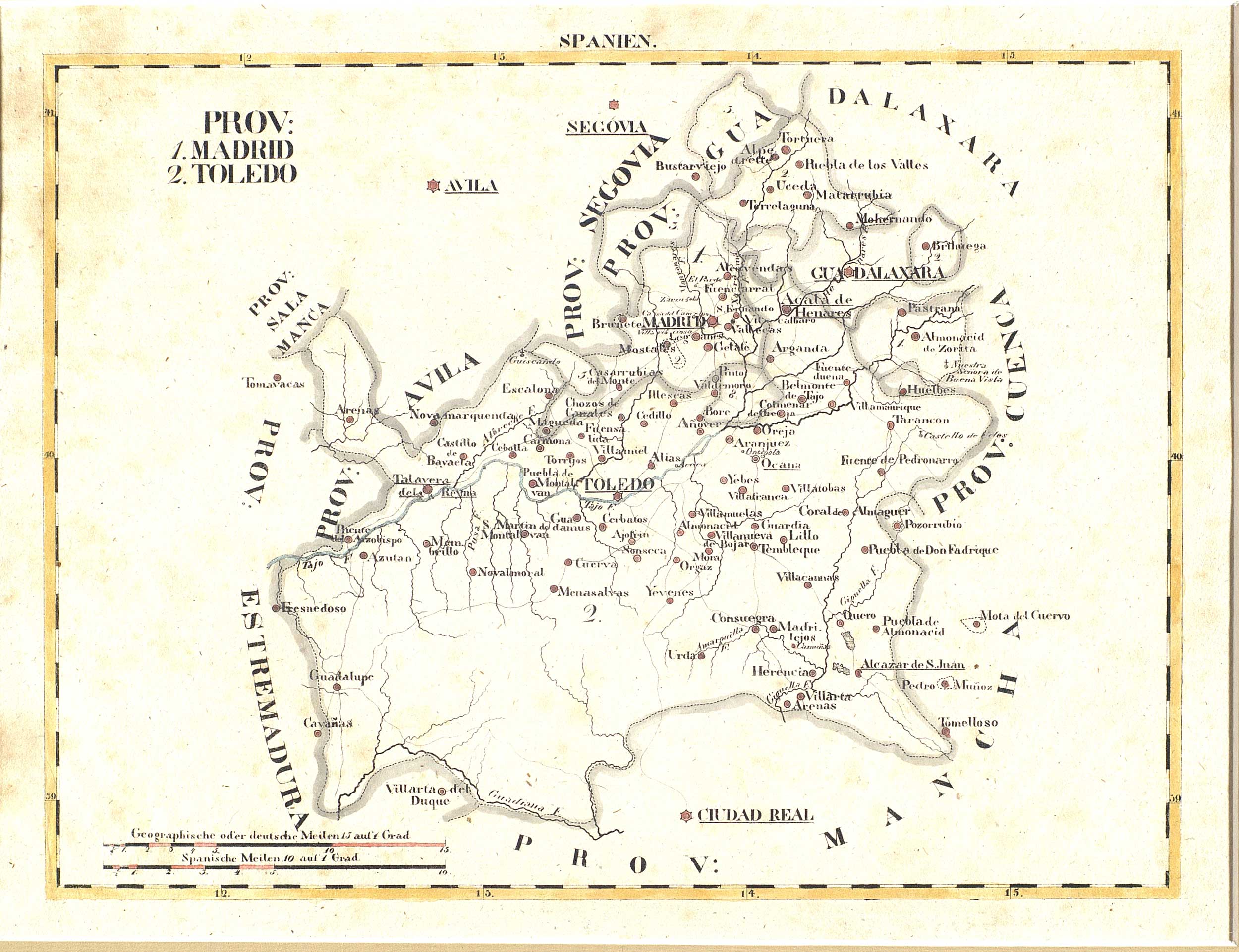 Publicado en Madrid, por el Establecimiento Geográfico Cº del Príncipe, en 1834. En la parte inferior indica los “Partidos Judiciales de la Provincia de Toledo” y su localización en el mapa.