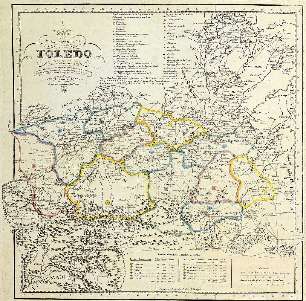 Mapa de la provincia de Toledo realizado por el ingeniero Benito Chías con delimitación cromática de los partidos judiciales