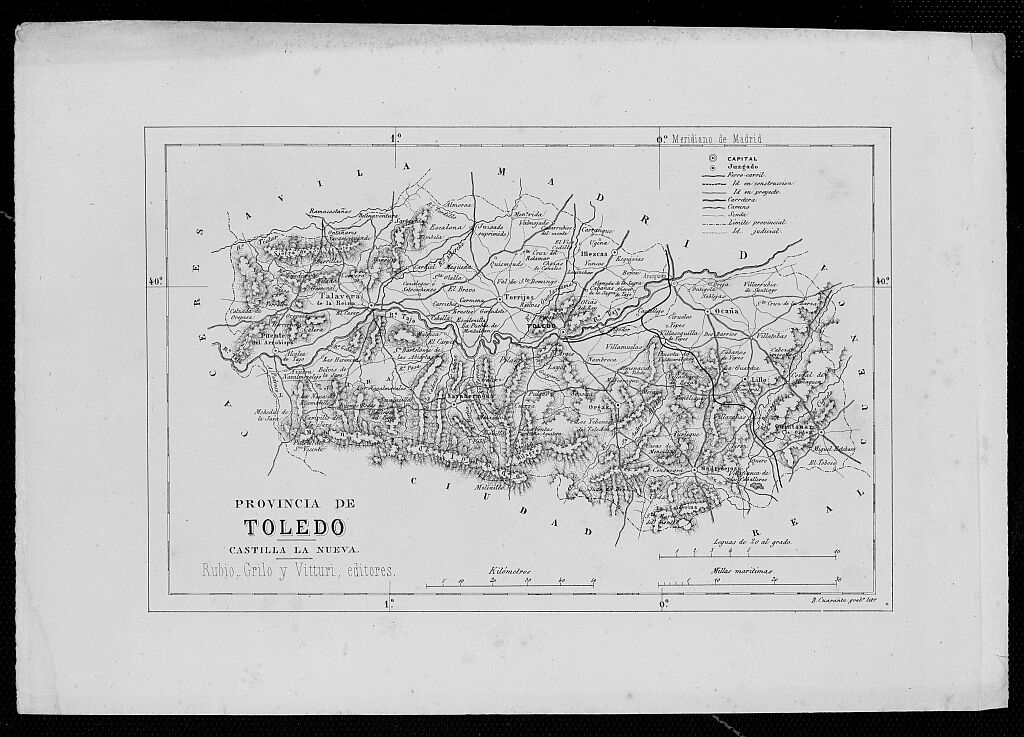 Mapa de la provincia de Toledo, Castilla la Nueva, grabado y litografiado por B. Cuaranta hacia 1866.