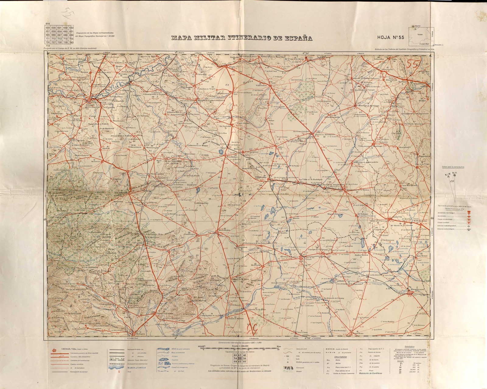 Hoja núm. 55 del “Mapa Militar Itinerario de España”, correspondiente a gran parte a la provincia de Toledo, formado por el Cuerpo de E. M. en 1931 y publicado por los Talleres del Instituto Geográfico y Catastral en 1933 [Escala 1:200.000, proyección de Bonne].