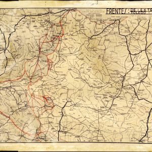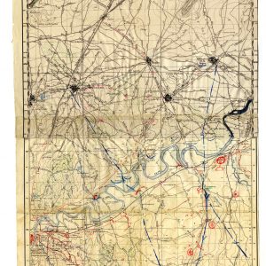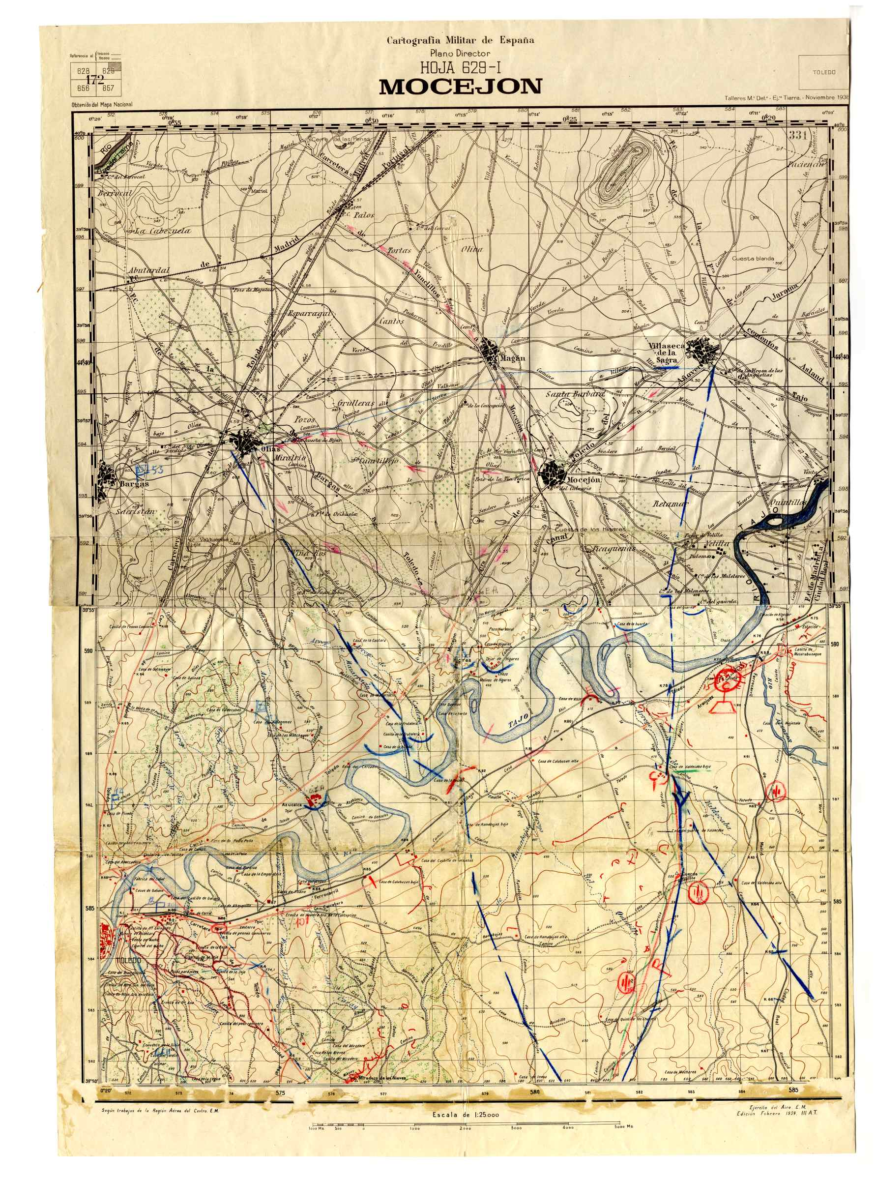 Este mapa posiblemente fue empleado en vuelos aéreos en los últimos meses de la contienda por lo que refleja, impresas en color rojo, las posiciones de las tropas. Contiene, también, anotaciones manuscritas realizadas con lápices de color rojo y azul que indican posibles trayectorias de vuelo.