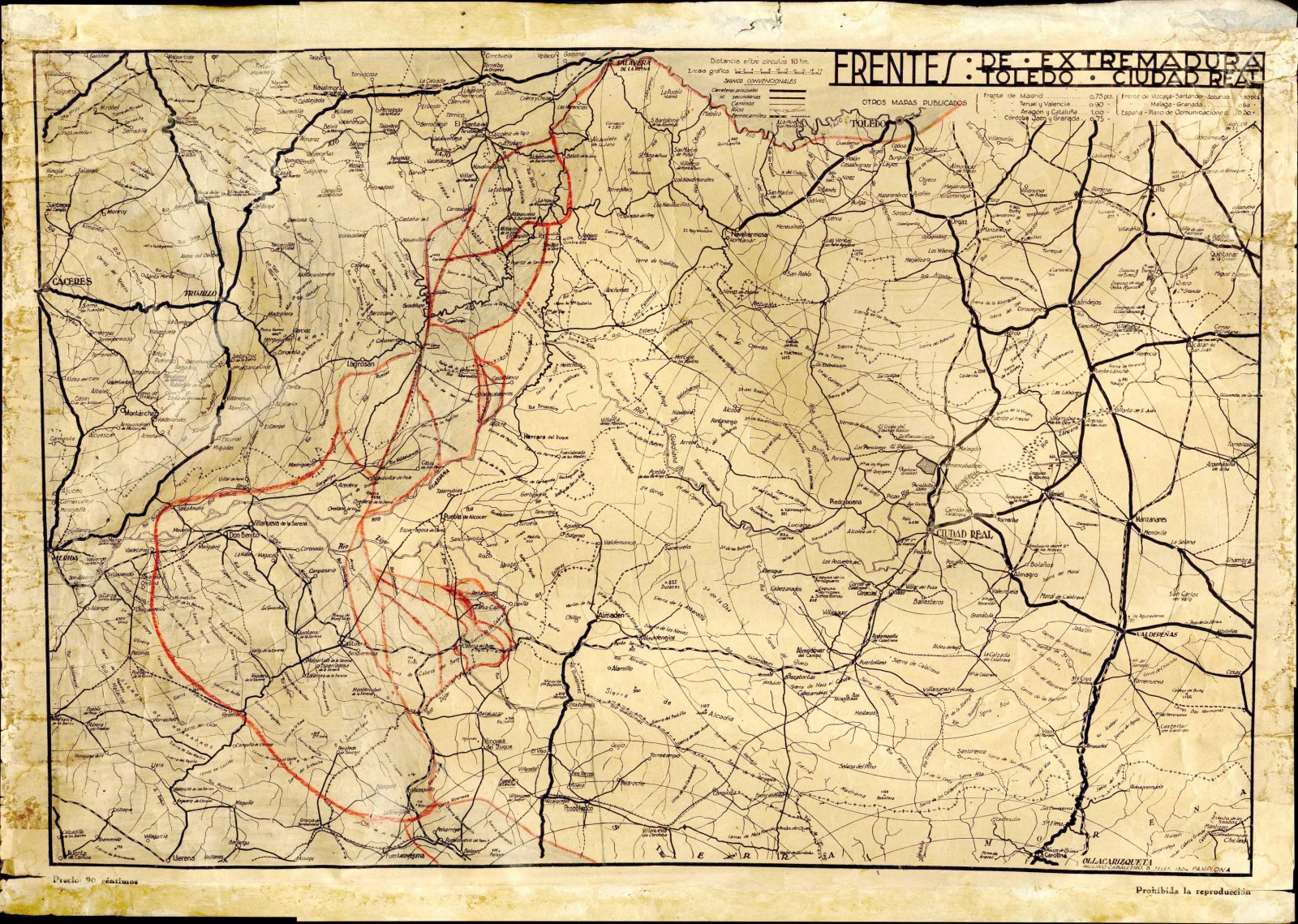 Mapa de demarcación de las líneas que separaban los dos ejércitos en el Frente de Extremadura, Toledo y Ciudad Real, con la inclusión de círculos concéntricos que indican la distancia que existía desde cualquier lugar hasta las ciudades de Cáceres, Toledo y Ciudad Real, realizado posiblemente a finales de 1937 o principios de 1938. [Escala aproximada 1 : 555.555]